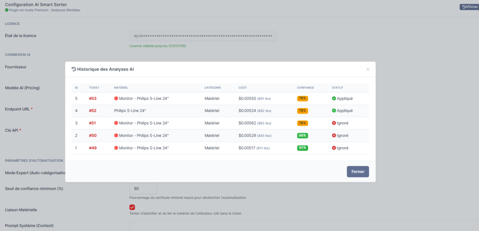 Réduisez drastiquement le temps de dispatching. En activant l’auto-pilote, le plugin qualifie les tickets et lie le matériel de manière autonome dès que le seuil de confiance est atteint.