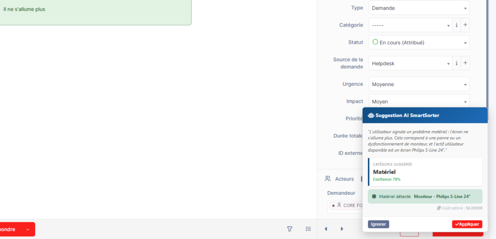 Son objectif est d’automatiser le tri de vos incidents. Ainsi, il agit comme un dispatcher virtuel de niveau 1, disponible instantanément pour chaque ticket. Le but est double : accélérer la prise en charge et garantir une classification parfaite des données ITIL.
